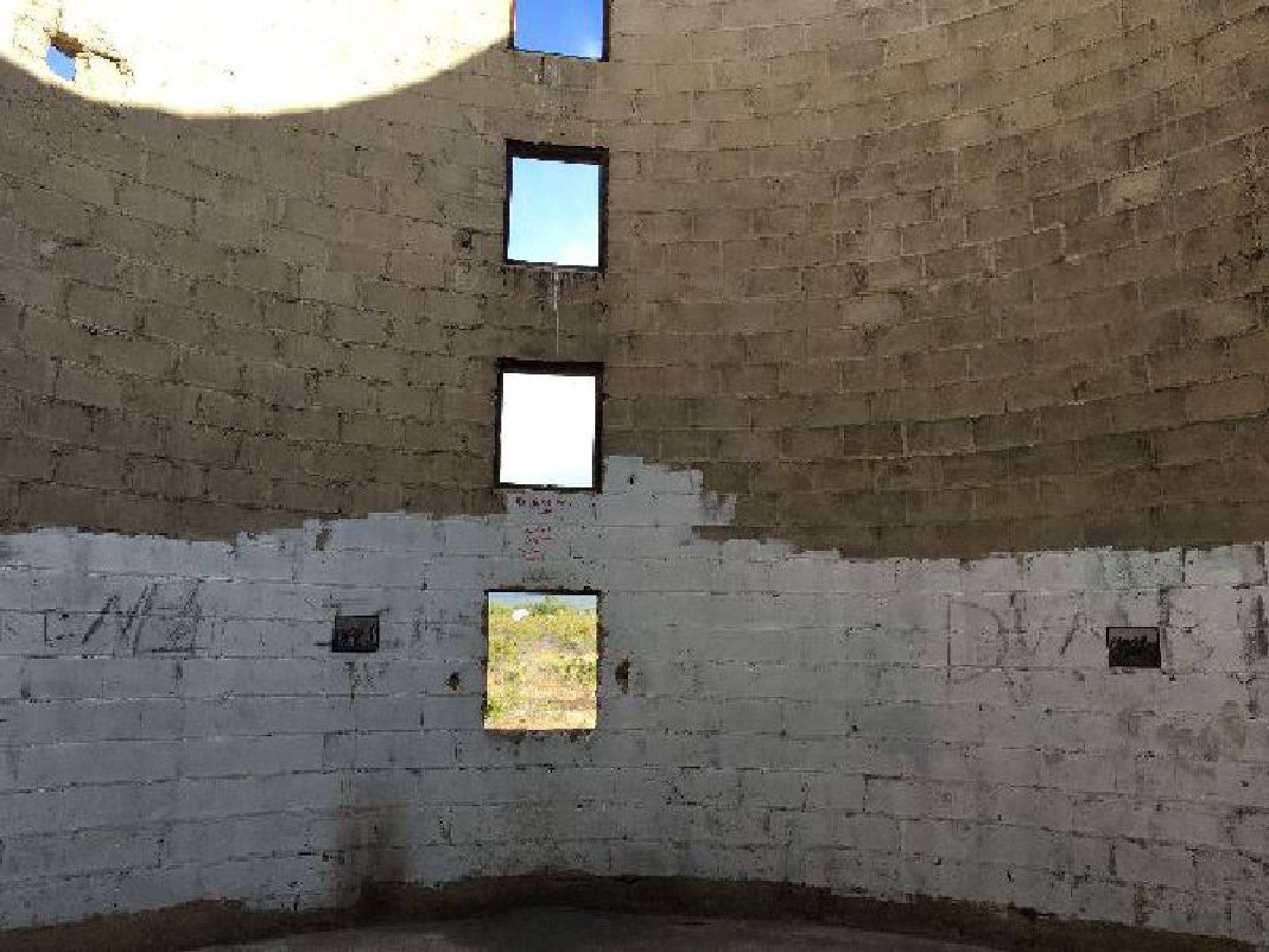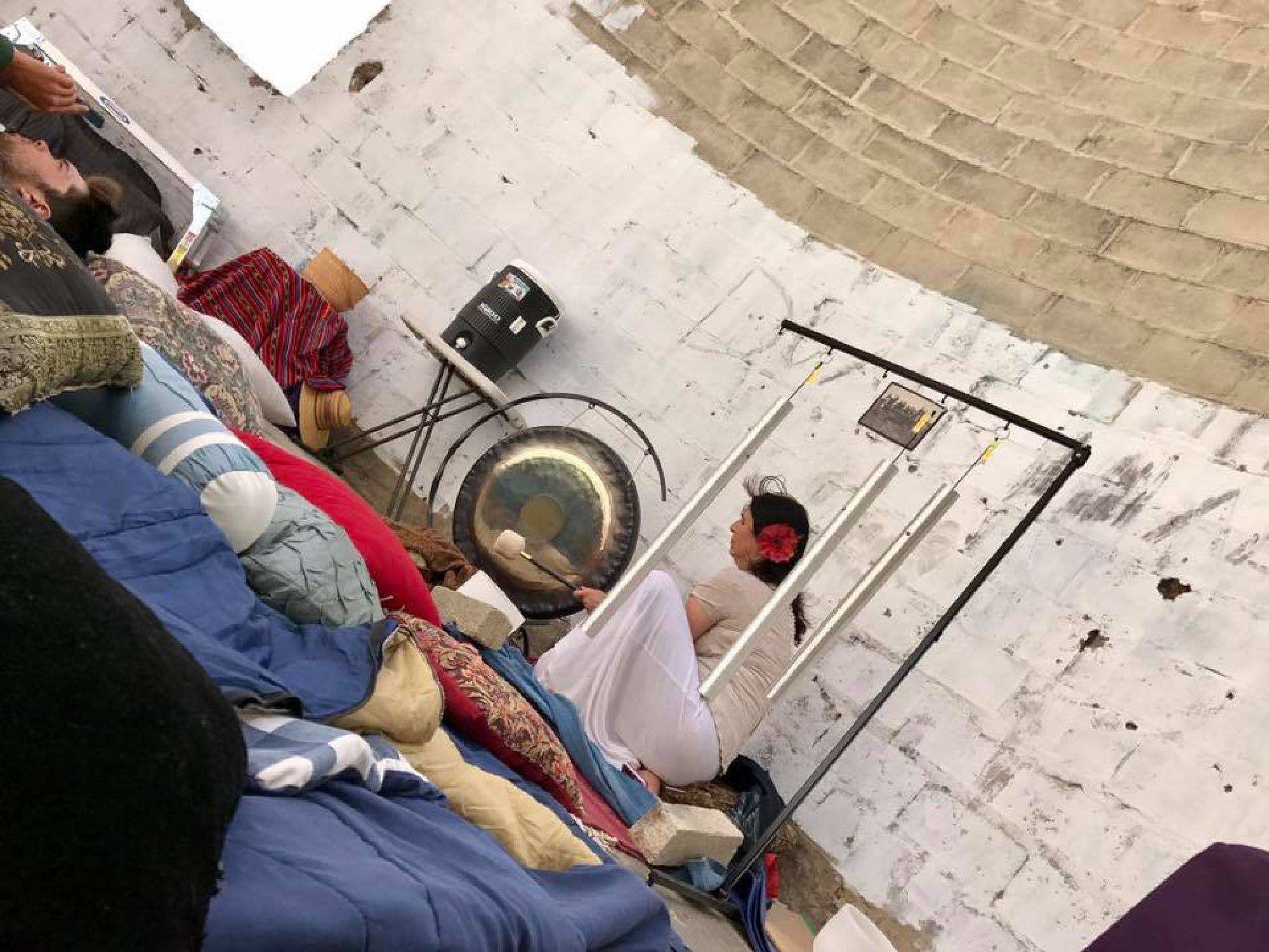 Jean Monte, Moriah Cain Gross and Kristen Cramer (Anahata Mousai) hosted the dairy barn and silo ruins where they offered a soundbath on the half hour from 10:30 to 3:30. The concrete silo was completed in 1916 with a three hundred ton capacity and excellent acoustics. While not used for grain storage, the exterior metal straps kept fermented greens contained, only one of which remains today around this sturdy structure engineered by colonist Bradford Mathewson.