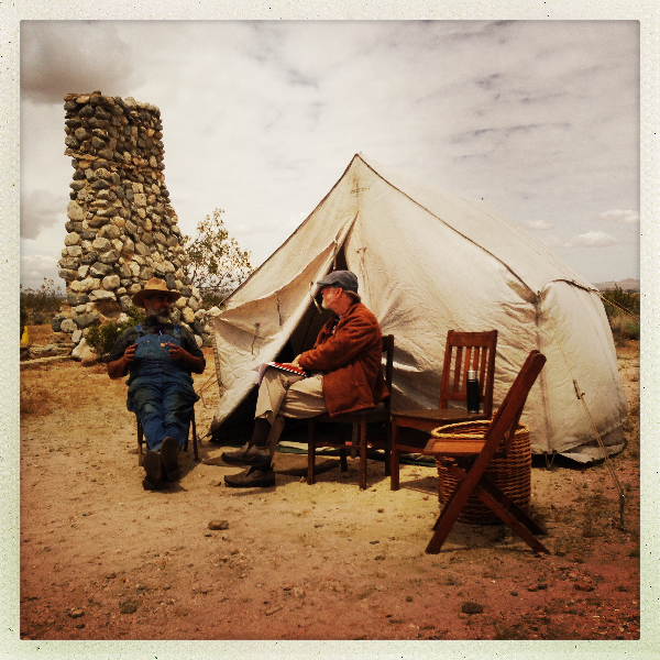 Paul Greenstein and Dr. Dydia DeLyser hosted the hotel/clubhouse ruins and the north most portion of the colony. Many community structures were located here, the post office, steam laundry, soap factory, print shop, founder Job Harriman’s tent and a large swimming hole. Guests visited the tent to view their collection of Llano del Rio ephemera, parked nearby were their 1913 Metz roadster and 1910 Indian motorcycle.