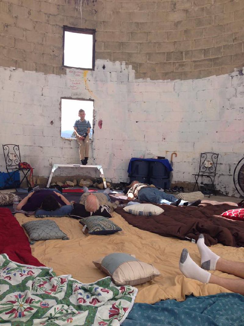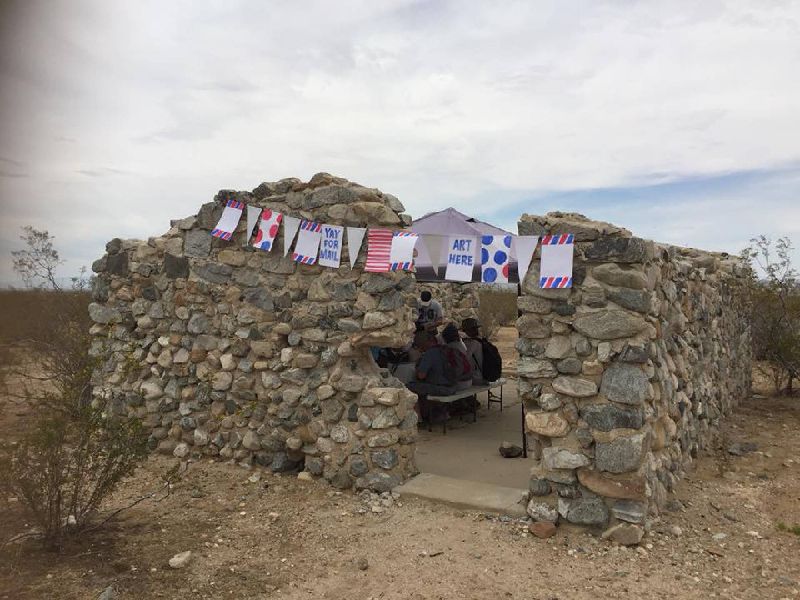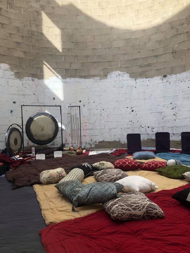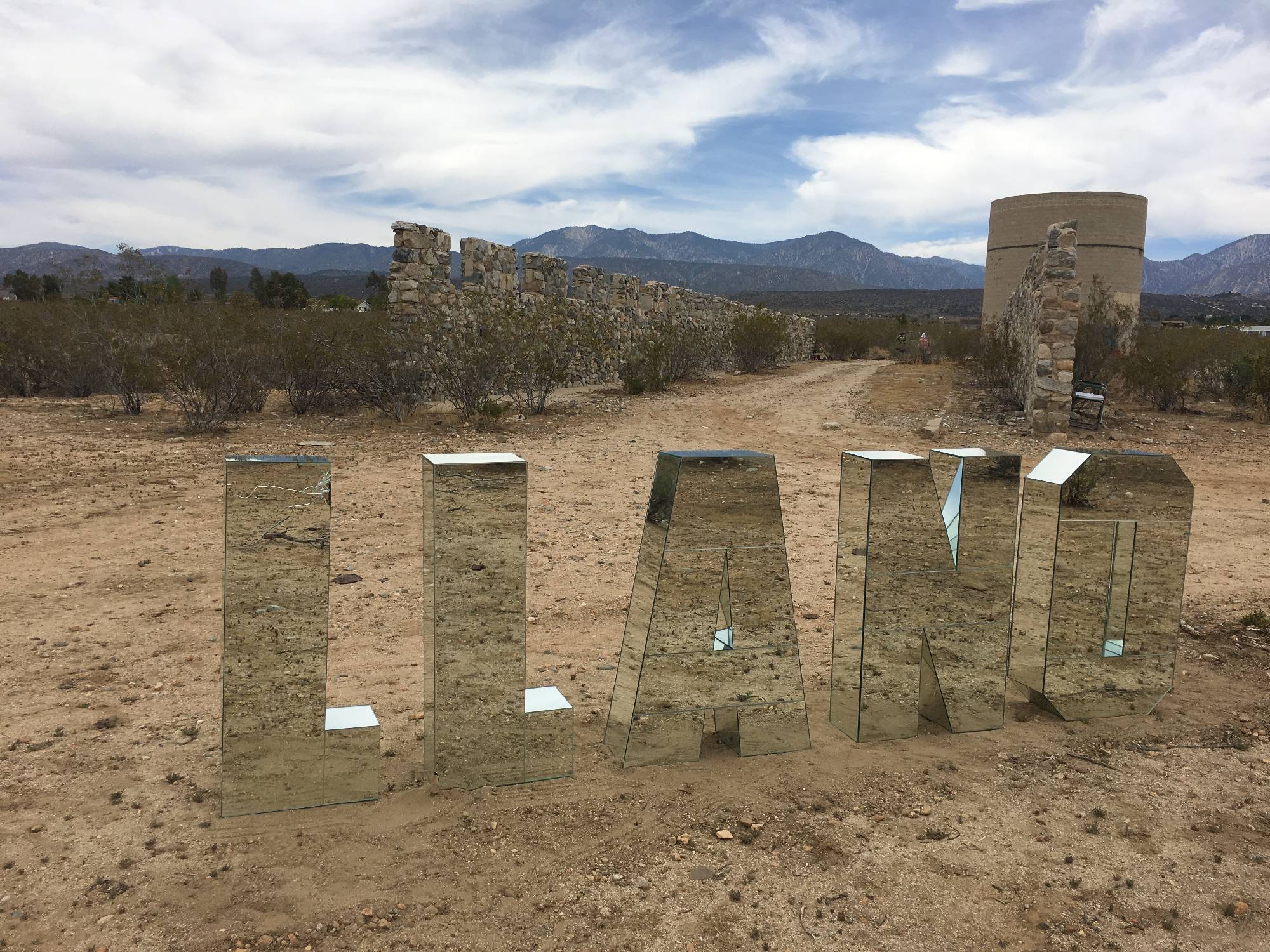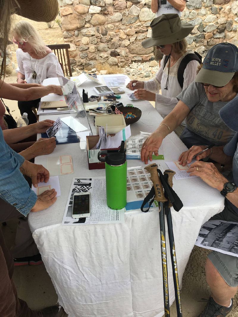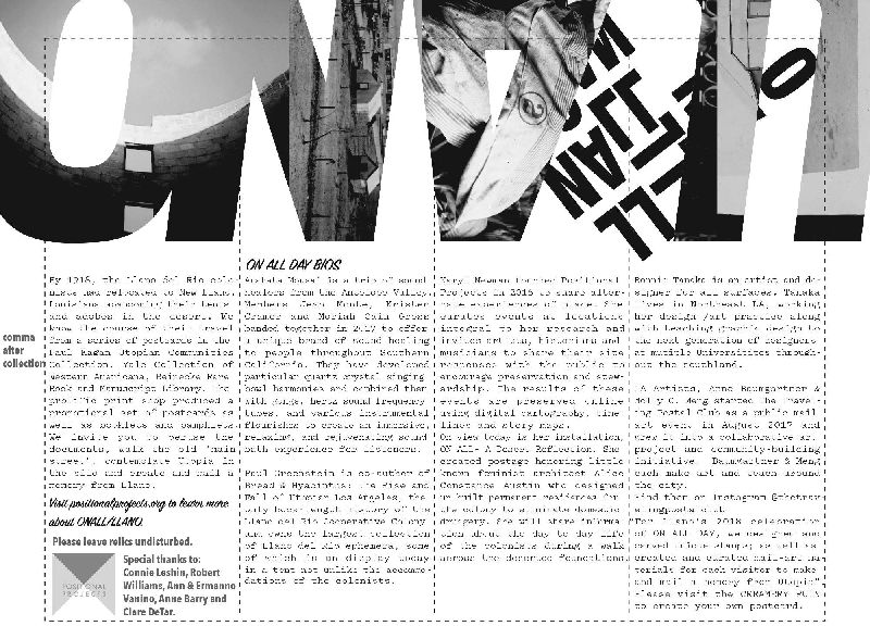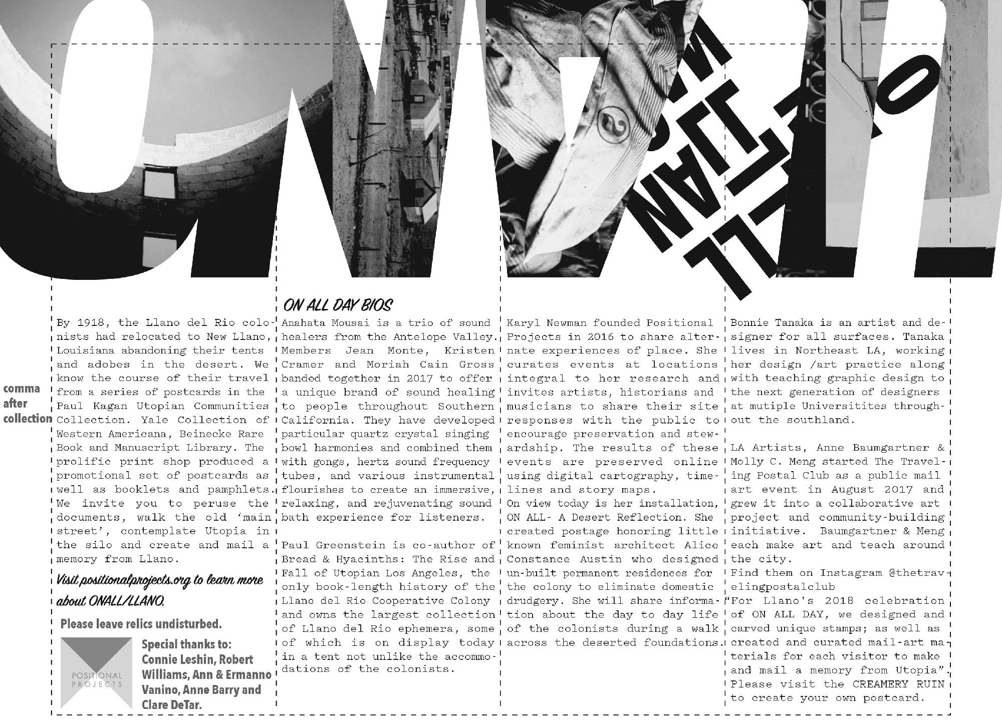 Positional Projects in collaboration with Anahata Mousai, the Traveling Postal Club, author Paul Greenstein and artist/organizer Karyl Newman presented “ON ALL Day – Future Foundations” a day long event featuring walks around the existing remnants of residences, a historical exhibit, the opportunity to create a commemorative postcard and enjoy a meditative sound bath magnified by the silo architecture, reflecting on the end of the Llano del Rio socialist Utopian community in the Antelope Valley. May 6th, 2018, with a map and guide created by Bonnie Tanaka.